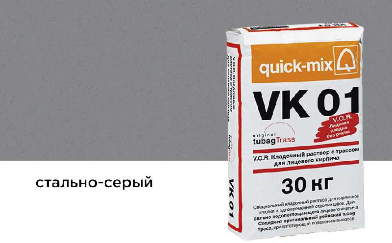 Цветной кладочный раствор quick-mix VK 01 с трассом для выполнения кирпичной кладки и одновременной отделки швов (в одном рабочем цикле) при использовании сильно водопоглощающего лицевого кирпича с водопоглощением ~ 8-10%.
